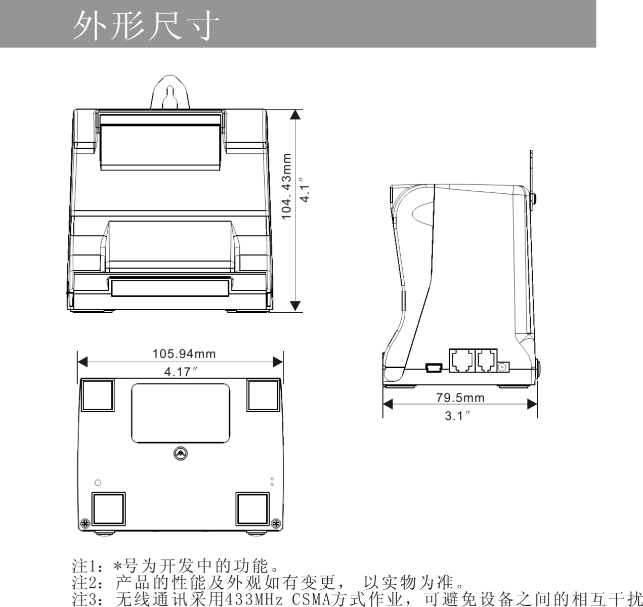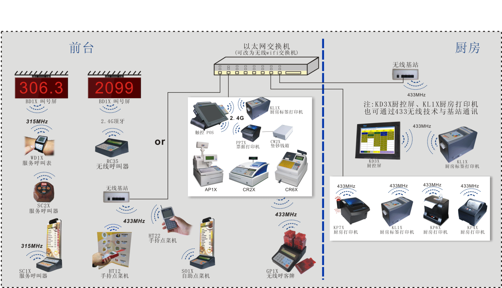 ※无线通讯模组有蓝牙、2.4G顶牙、433MHz长距离通讯模组可供选择(能避免油烟污染造成的接点通讯不良)。433MHz长距离(宽带跳频),通讯距离可达200至300M,且传输可靠性高,特别适用于大型高档餐厅。2.4G顶牙(宽带跳频)、蓝牙,短距离无线通讯,可省去与POS 、PC机通讯的连接线,使您的桌面更加整洁美观,让您不再为桌上布满各种通讯线而苦恼。