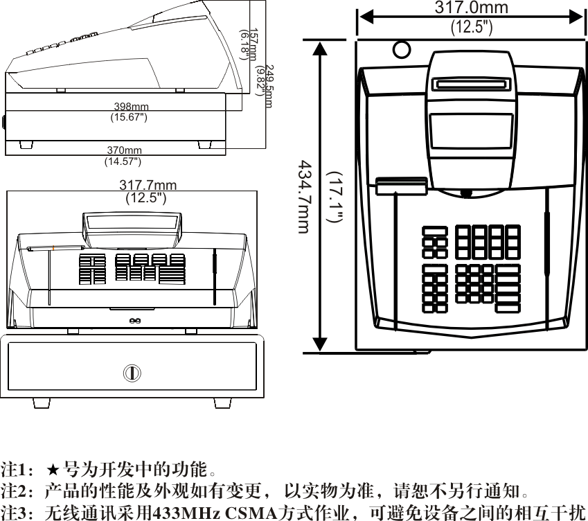 • 全中文热敏收银机,纸宽57mm,五行中文显示,配三秒格小钱箱;